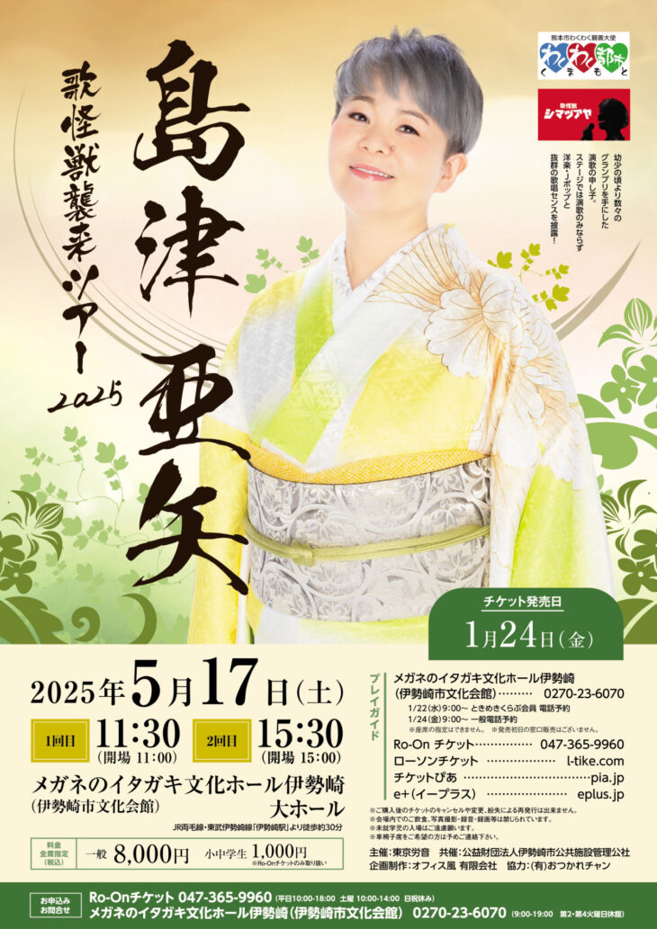 5/17(土) 11:30 / 15:30開演(各回30分前開場)メガネのイタガキ文化ホール伊勢崎(伊勢崎市文化会館)大ホール料金(税込)全席指定 : 8,000円